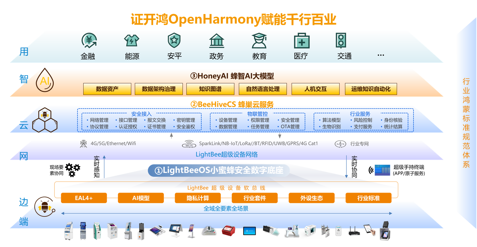 證開(kāi)鴻作為開(kāi)源鴻蒙生態(tài)的推動(dòng)者及鴻蒙生態(tài)服務(wù)公司的重要合作伙伴,依托LightBeeOs操作系統(tǒng)\BeeHiveCS蜂巢云服務(wù)\HoneyAI蜂智AI大模型,構(gòu)建一個(gè)完整的智能生態(tài)系統(tǒng),為用戶打造“端、邊、云、網(wǎng)、智、用”的全棧服務(wù)與解決方案。依托在金融行業(yè)的全產(chǎn)業(yè)鏈優(yōu)勢(shì)為用戶提供全場(chǎng)景全聯(lián)接、全流程、一體化的全棧式解決方案,實(shí)現(xiàn)以企業(yè)為主體、以場(chǎng)景為牽引、以標(biāo)志性產(chǎn)品為抓手,踐行未來(lái)產(chǎn)業(yè)創(chuàng)新發(fā)展目標(biāo)的實(shí)施,推動(dòng)數(shù)字化發(fā)展全面升級(jí)。
