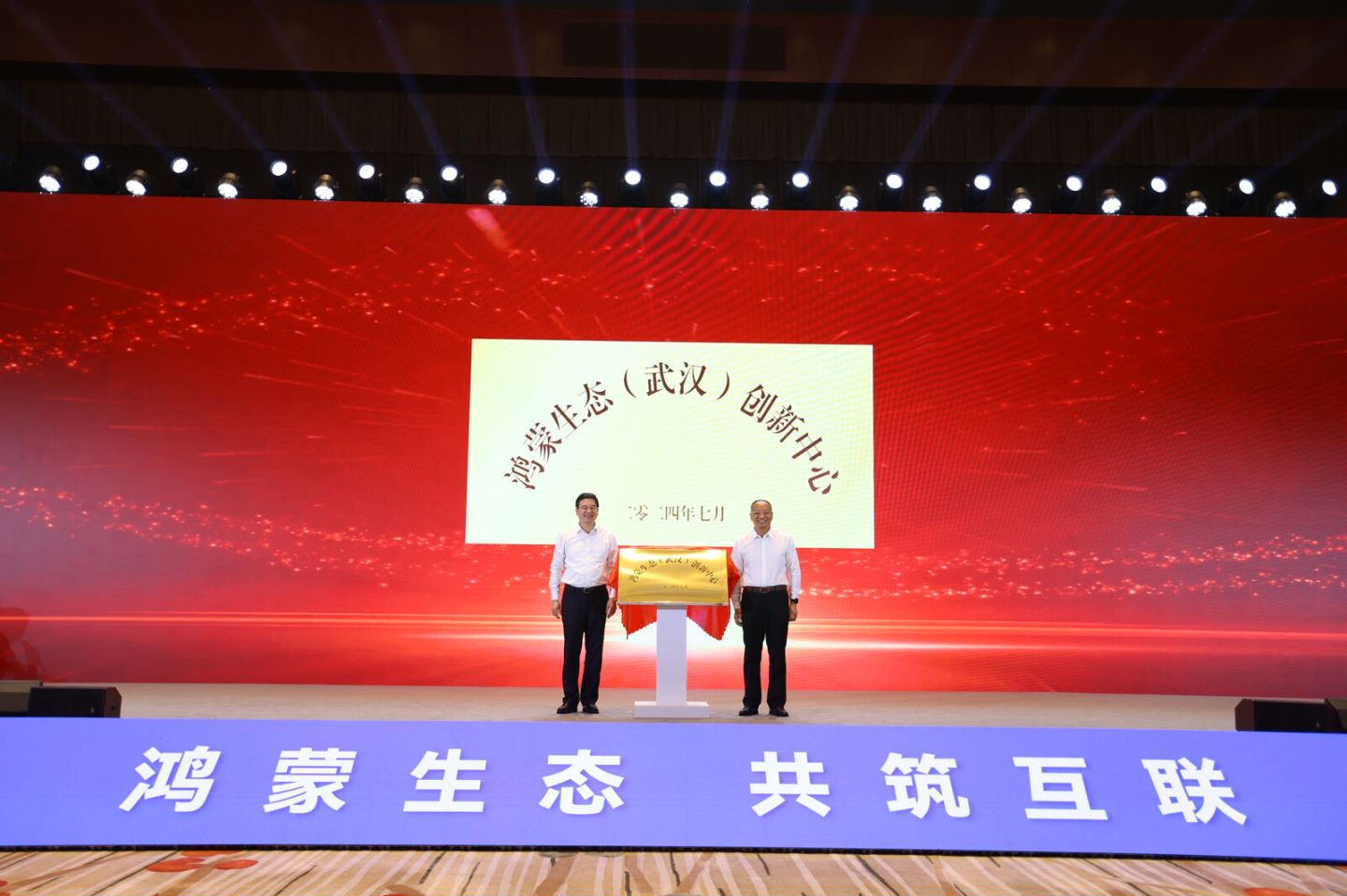 武漢市委副書(shū)記、市人民政府市長(zhǎng)盛閱春(左)鴻蒙生態(tài)服務(wù)(深圳)有限公司總經(jīng)理杜金彪(右)共同為鴻蒙生態(tài)(武漢)創(chuàng)新中心揭牌